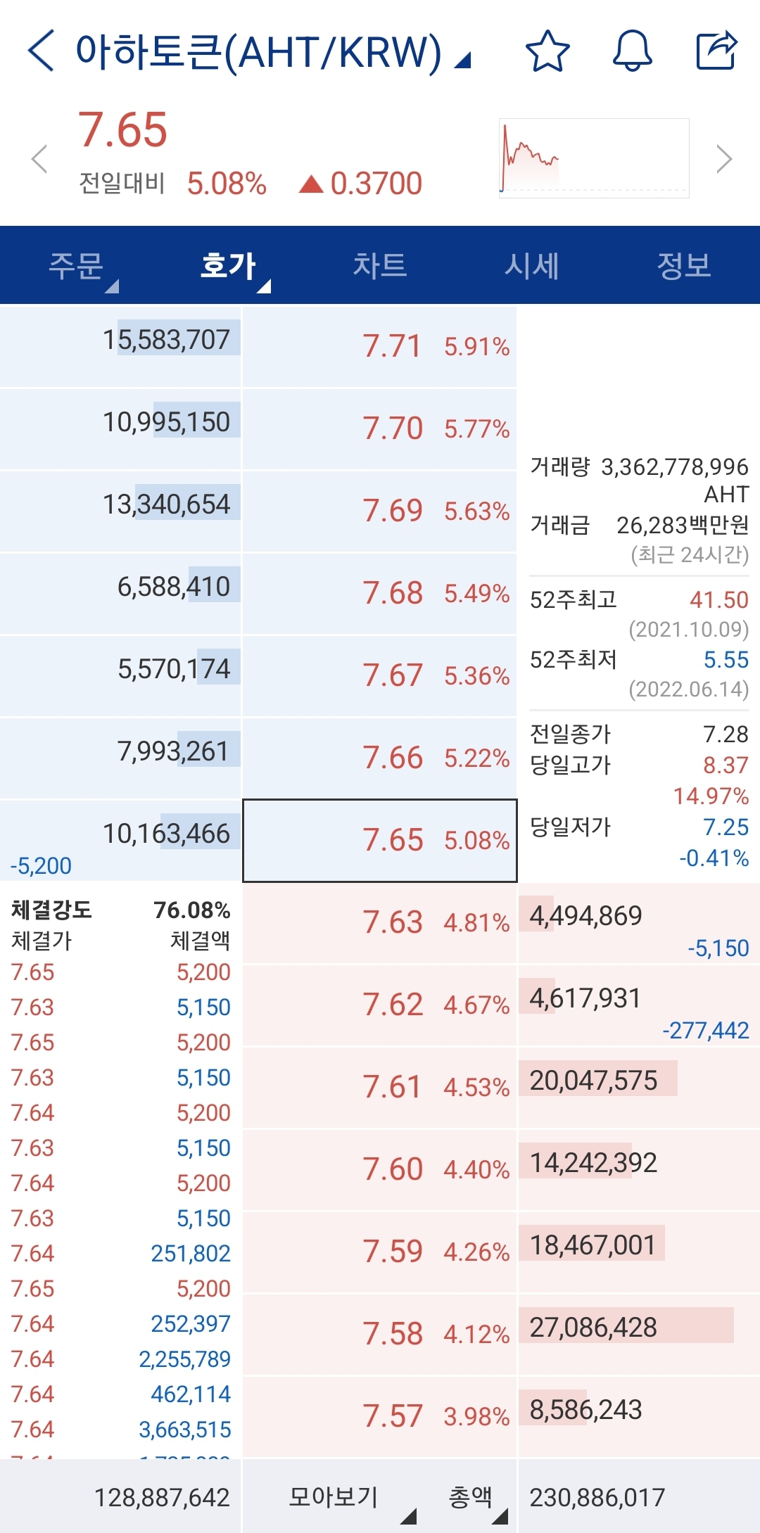 전일대비 14.97% 올라 8.37원까지 거래되었습니다. 아래에서 호가창과 아하토큰 차트를 확인해볼 수 있습니다.